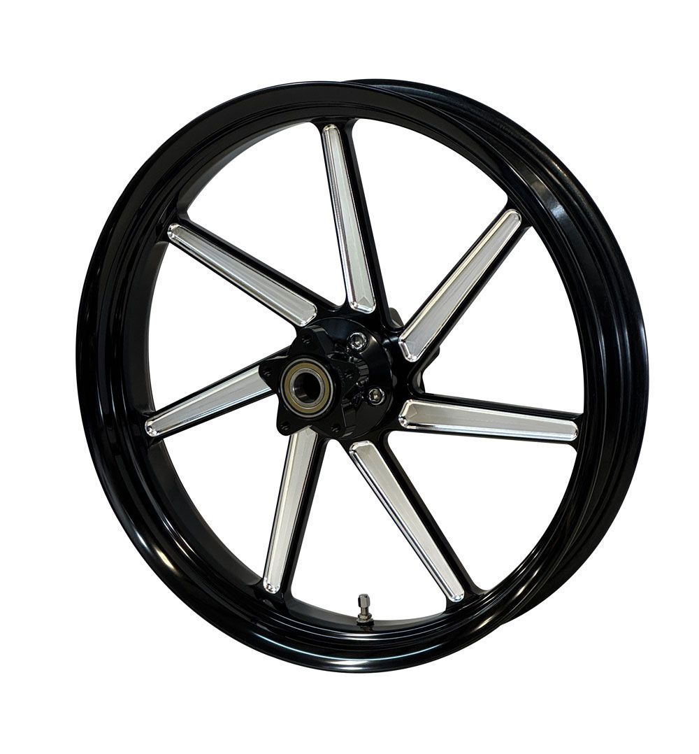 Phantom Cut DM7 Forged Billet WheelThe latest wheel addition from HHI/Renegade Wheels for the HD Touring Market is the DM7, a New Bagger Performance 7-spoke custom wheel available in a full range of standard sizes from 16 to 32 inches, including popular wide-tire fitments of 21, 23, and 26 x 5.5 inches. Finishes include Phantom Cut, Chrome, Black, Inca Gold, Cobalt Blue, and Aztec Red.